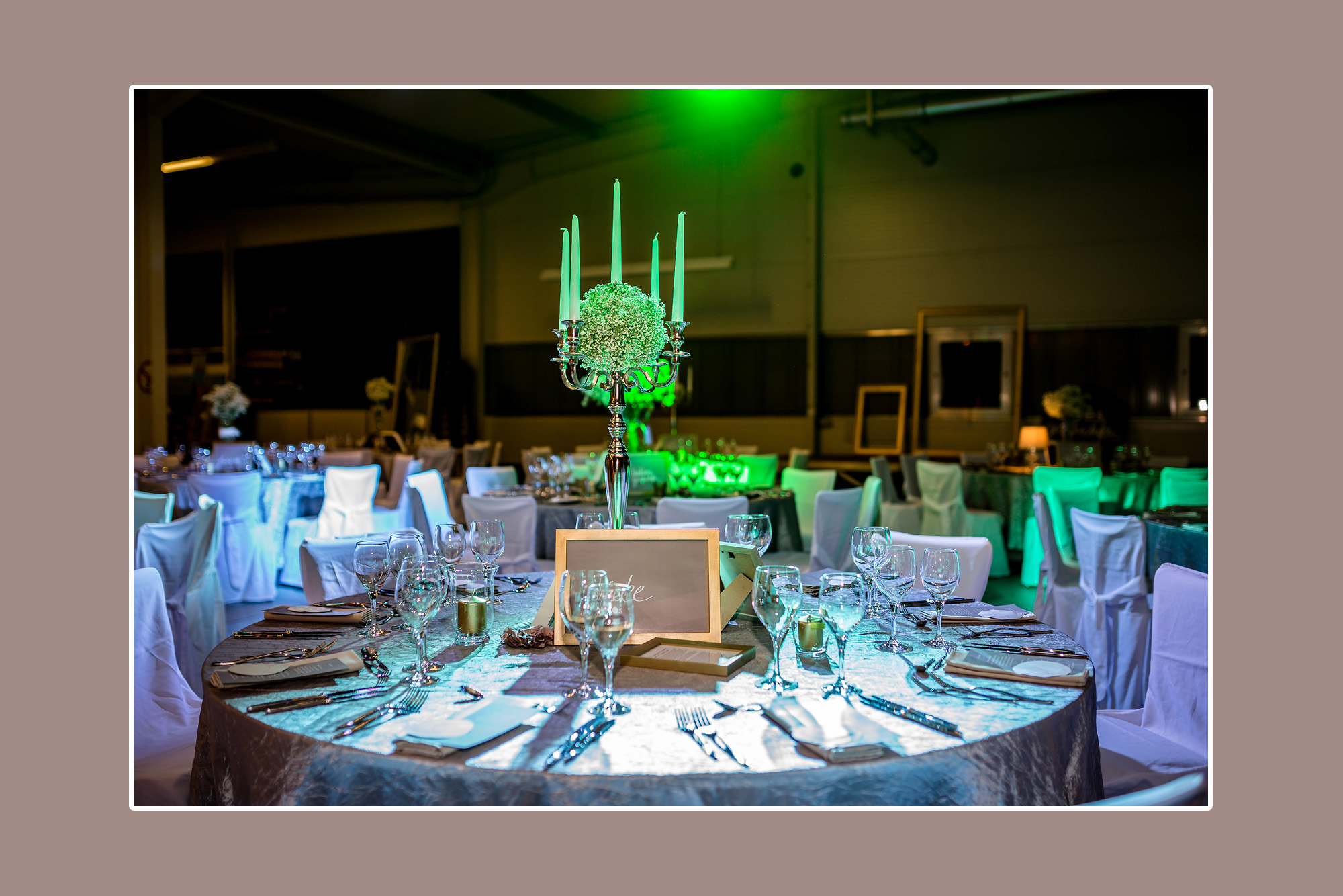 Nach der Trauung ging die Feier in einer großen Halle weiter. Dort wurde eine romantische Beleuchtung eingestellt und eine Bankettzone mit runden Tischen eingerichtet. Rundherum standen natürlich wieder ganz viele Stühle, die selbstverständlich ebenfalls mit gemieteten weißen Stuhlhussen dekoriert wurden.